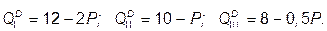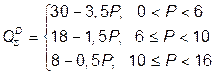 Для определения интервалов цен, соответствующих различным наклонам кривой рыночного спроса, перейдем от индивидуальных функций спроса к индивидуальным функциям цены с Следовательно, в интервале 10 ≤ P < 16 рыночный спрос представлен спросом покупателя III; в интервале 6 ≤ P < 10 рыночный спрос равен сумме спросов II и III покупателей и в интервале 0 < P < 6 – сумме спросов всех трех покупателей: