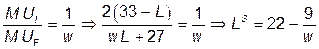 F – свободное время, равное разности между календарным временем (Т) и рабочим временем: F = Т – L. Сколько часов индивид будет работать в течение календарного времени Т = 33 при цене труда w = 3?