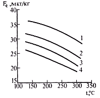 | Рисунок 2. Растворимость магнетита в кипящей воде в зависимости от ее температуры: 1 — рН=5,0; 2 — рН=5,5; 3 — 2рН=6,0; 4 — рН=7,0. |