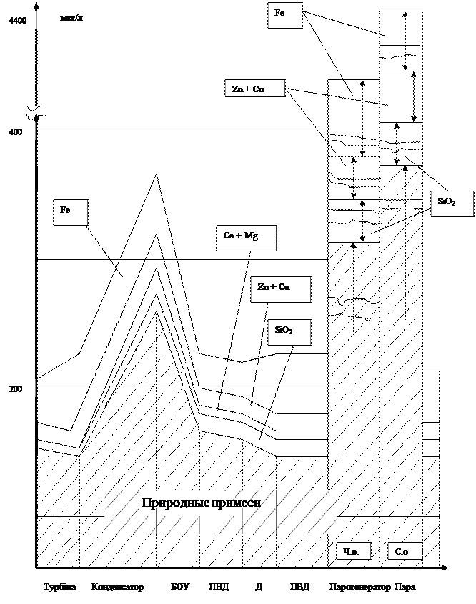 Рис. 2.3. Концентрации примесей по тракту 2-го контура блоков АЭС с ВВЭР
