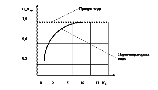 Считают, что концентрация ПГ воды и продувочной воды совпадают. Однако это не совсем так. На рис.3.2 наведены данные о связи концентрации примесей в парогенераторной воде и кратности циркуляции.