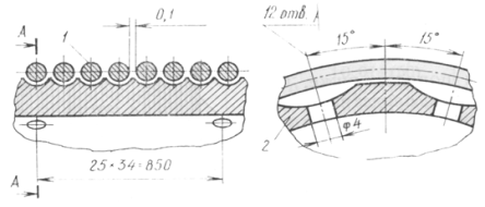 1 – проволовка для навивки. Навивка ведётся с шагом (щелью) в 0,1 мм, 2 – перфорированая труба (патрон), 3 – отверстия диаметром 4 мм в патроне, размещаются под углом 15о