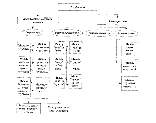 Основной объект конфликтологии составляют семь видов социальных конфликтов. Межличностные конфликты представляют собой столкновения интересов двух людей. Если начальник отдела противопоставил себя группе подчиненных, то это будет конфликт типа «личность-группа». Борьба н учительском коллективе средней школы между сторонниками директора и его противниками - это конфликт между малыми группами. Средние социальные группы по количественному составу занимают промежуточное положение между малыми и большими. Если количество участников конфликта превышает несколько сотен человек, то это конфликт между большими социальными группами. Международные конфликты представляют собой борьбу между двумя государствами или их коалициями. Может также возникнуть конфликт между государством и группой государств. Кроме того, коалиции государств могут насчитывать от нескольких участников до большого числа их. Это влияет на характер международного конфликта.