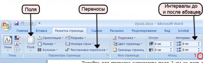 В разделе "Абзац" можно установить промежутки между абзацами текста, отдельно до абзаца и после него. Напоминаю: наши манипуляции применяются к выделенному тексту, а если ничего не выделено, то только к тому абзацу, на котором стоит курсор. Как правило, выделив весь текст, в этих окошках я выставляю нули. Нажав на кнопку, помеченную на рисунке выше цифрой 1, мы попадаем на вкладку "Отступы и интервалы" диалогового окна "Абзац". В это же окно можно попасть, нажав аналогичную кнопку на вкладке "Главная" раздел "Абзац". Обратите внимание на кнопку "По умолчанию...". Она делает заданные Вами параметры постоянными для всех новых документов.
