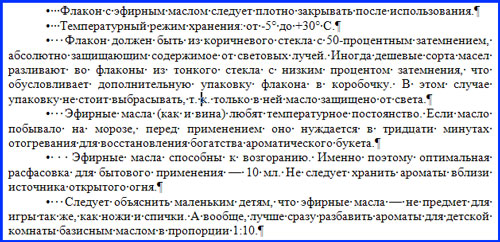 На нём явственно видно, что три пробела, которыми маркеры списка отделены от текста, занимают разное пространство на разных строчках. Чтобы избежать такого эффекта, следовало бы оформить текст как "Маркированный список" или, на худой конец, использовать знаки табуляции вместо пробелов. Однако подробнее о списках мы поговорим позже, на шаге 7.