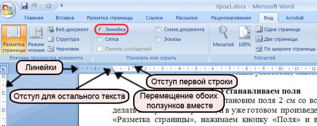 Исходя из вышеизложенного, займёмся отступом первой строки. Обыкновенная его величина составляет 1,25 см. Его можно также установить вручную, перетащив верхний ползунок на горизонтальной линейке. Если линейки отсутствуют, их можно отобразить, поставив нужную галочку на вкладке "Вид".