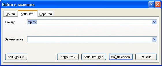 . Вы увидите знаки абзацев, пробелы, разрывы строк и прочие обычно неотображаемые знаки форматирования. На печать эти знаки не выводятся. Отключить их можно повторным нажатием клавиш Ctrl+* или кнопки "Отобразить все знаки". Удалять лишние пробелы вручную слишком утомительно, поэтому воспользуемся функцией поиска Ворда: вкладка "Главная", раздел "Редактирование", строка "Заменить". Открывается диалоговое окно "Найти и заменить" на вкладке "Заменить". В верхней строке с именем "Найти" вводим два пробела (при этом визуально строка остаётся пустой), в нижней строке с именем "Заменить" - один пробел. Нажимаем кнопку "Заменить все". Word произведёт замены и покажет их количество. Нажимаем кнопку "Заменить все" ещё раз, и ещё, и ещё - до тех пор, пока количество произведённых замен не станет равно нулю. Найти оставшиеся пробелы в начале абзацев можно, введя комбинацию подстановочных знаков "^p ^?" (без кавычек) в поле "Найти" и нажав кнопку "Найти далее". Эта последовательность означает следующее: знак абзаца, пробел и любой знак. Удалять найденный пробел придётся вручную. Если Вы знаете способ автоматизации этого процесса, напишите мне, я буду Вам очень благодарна.