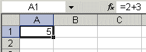 Выделим произвольную ячейку, например А1. В строке формул введем =2+3 и нажмем Enter. В ячейке появится результат (5). А в строке формул останется сама формула.