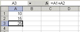 Введите в ячейку А1 число 10, а в ячейку А2 - число 15. В ячейке А3 введите формулу =А1+А2. В ячейке А3 появится сумма ячеек А1 и А2 - 25. Поменяйте значения ячеек А1 и А2 (но не А3!). После смены значений в ячейках А1 и А2 автоматически пересчитывается значение ячейки А3 (согласно формулы).