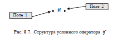 Условный оператор. Этот оператор используется только в теле П-Ф и для его ввода необходимо щелкнуть на кнопке if палитры ПРОГРАММИРОВАНИЕ. На экране появляется кон- струкция с двумя полями ввода, изображенная на рис. 8.7.
