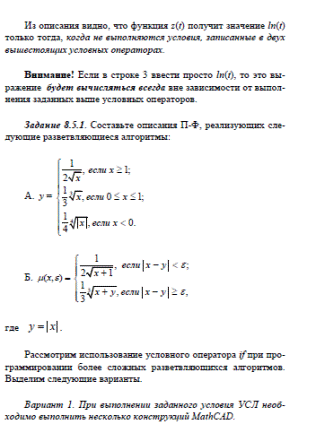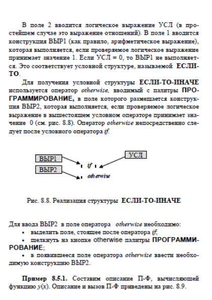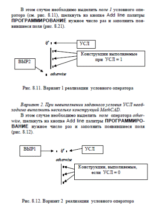 Для программирования разветвляющихся алгоритмов в подпрограмме-функции MathCAD можно использовать услов- ную функцию и условный оператор if. Используя эти конструк- ции, можно «изменить» последовательное выполнение операто- ров. Условная функция if была рассмотрена в п. 7.2, поэтому пе- рейдем к изучению условного оператора if.