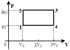(1 балл). Знание геометрического смысла работы газа в в цикле. A1234 равна площади прямоугольника 1-2-3-4, изображающего график цикла в координатах p-V: A1234 = 2p0V0.