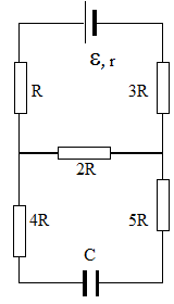(1 балл) Указание на то, что напряжение на конденсаторе равно напряжению на резисторе 2R, поскольку ток по резисторам 4R и 5R в установившемся режиме в цепи не течет, и разность потенциалов на них равна нулю.