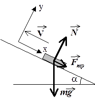 (1 балл). Наличие записи второго закона Ньютона в проекциях на ось, перпендикулярную плоскости, и ось, направленную вдоль плоскости вниз, для движения шайбы вверх (рис.):