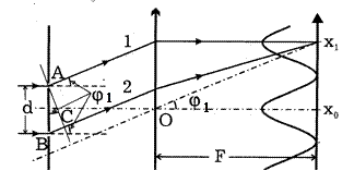 На рис. показан ход лучей 1 и 2 (луч – направление распространения световой волны), образующих интерференционный максимум первого порядка на расстоянии X1 от центрального (нулевого) максимума. Ход лучей, образующих второй максимум, строится аналогично, только лучи 3 и 4 пойдут под бóльшим по сравнению с j1 углом j2 по отношению к главной оптической оси линзы.