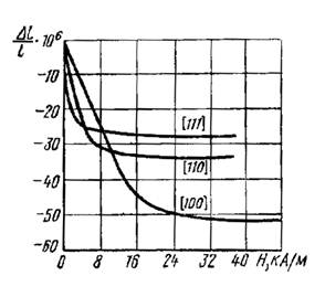 з трех основных ферромагнитных элементов (Fe, Ni, Co) наибольшей магнитострикцией обладает никель. На рис. 9.4 приведены зависимости относительного изменения линейных размеров монокристалла никеля по различным осям от напряженности внешнего поля.