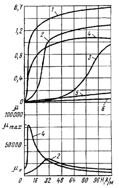 ис 9.5. Зависимости магнитной индукции В от напряженности магнитного поляmи магнитной проницаемости Н: 1 — железа особо чистого; 2 — железа чистого <99,98% Fe); 3 — железа технически'чистого (99,92% Fe); 4—пермаллоя (78% Ni); 5—никеля; 6 — сплава железо-никель (26% Ni)