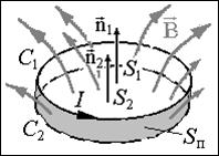 На рисунке 4.2.5 изображены два последовательных состояния контура С1 и С2. Поверхности S1 и S2, которые ограничивает контур в положениях С1 и С2 и поверхность Sп, прочерченная контуром, составляют замкнутую поверхность. По теореме Остроградского-Гаусса для магнитной индукции суммарный поток через эту замкнутую поверхность равен нулю. Выберем нормали n 1 и n 2 к поверхностям S1 и S2 при вычислении потокосцеплений Y1 и Y2 в каждом из положений так, чтобы они были согласованы с направлением тока в контуре по правилу правого винта (из конца вектора нормали ток в контуре виден идущим против часовой стрелки). При этом поток наружу из замкнутой поверхности складывается из потока через S 1 в направлении n 1 (равен Y1), потока через S 2 в направлении противоположном n 2 (равен - Y2) и потока через прочерченную поверхность S п (Фм). Таким образом, получаем