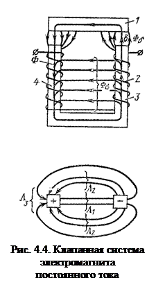 Основные соотношения для магнитной цепи электромагнита рассмотрим на примере клапанной системы (рис. 4.4). Подвижная часть магнитной цепи, создающая рабочее усилие, называется якорем 1. Участки магнитопровода 3 и 4 называют стержнями или сердечниками.