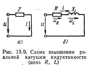 В соответствии с этим катушку в схеме замещения можно представить активным и индуктивным сопротивлениями, соединенными последовательно (рис. 13.9, б).