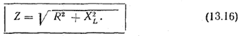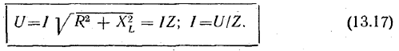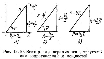 Стороны треугольника напряжений, выраженные в единицах напряжения, разделим на ток I. Получим подобный треугольник сопротивлений (рис. 13.10, б), катетами которого являются активное R = U R /I и индуктивное X L = U L /I, сопротивления, а гипотенузой величина Z = U/I.