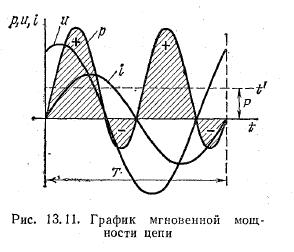 Из графика мгновенной мощности (рис. 13.11) видно, что в течение периода мощность четыре раза меняет знак; следовательно, направление потока энергии и в данном случае в течение периода меняется. Относительно некоторой оси t’, сдвинутой параллельно оси t на величину Р, график мгновенно мощности является синусоидальной функцией двойной частоты.