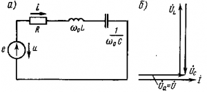 Рис. 196. Схема (а) и векторная диаграмма (б) электрической цепи, содержащей R, L и С, при резонансе напряжений