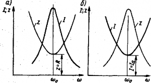 Рис. 197. Зависимость тока I и полного сопротивления Z от? для последовательной (а) и параллельной (б) цепей переменного тока