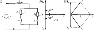 Из рис. 198, в следует, что ток I в неразветвленной части цепи совпадает по фазе с напряжением U, так как реактивные токи 1L и Iс равны, но противоположны по фазе, вследствие чего их векторная сумма равна нулю.