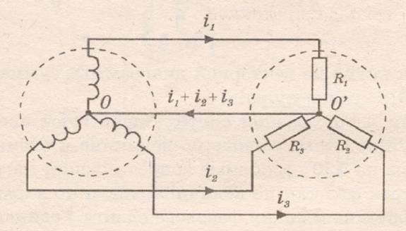 Суммарный ток, т.е. ток в общем проводе равен нулю, поэтому провод ОО´ называется нулевым. Провода, соединяющие начала обмоток генератора с приёмником электроэнергии, называются линейными. Система трёхфазного тока с нулевым проводом (или нейтралью) называется четырёхпроводной.