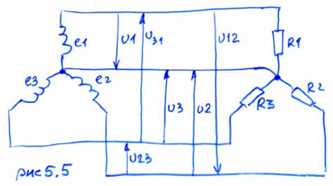 Если фазное напряжение равно 220В, то линейное – 380В. Если нагрузка становится неравномерной, то можно считать, что соотношение (5.5) соблюдается, только в этом случае в нейтральном проводе течёт ток.
