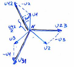 Мы видим, что линейные напряжения также образуют трёхлучевую звезду, повёрнутую относительно звезды фазных напряжений на угол 30˚ против часовой стрелки. Рассмотрим соотношение между модулями линейных и фазных напряжений. Из треугольника U12U1N получим U12/2 = U1∙ cos30˚ = U1∙√3/2,