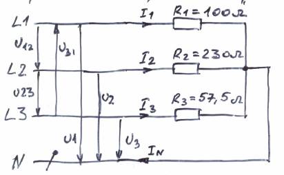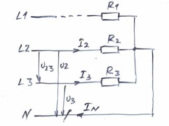 Если нейтральный проводник целый, то повреждённая фаза останется без питания. В остальных фазах нормальная работа продолжится. I2 = U2/R2 и I3 = U3/R3.