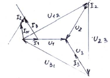 Ток в нейтральном проводе будет равен геометрической сумме I2 + I3.