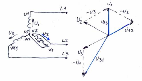 Ещё раз о соединении обмоток генератора или трансформатора. Важно учитывать, чтобы обмотки трансформатора или генератора были соединены правильно. Это значит, что начала обмоток соединяются с линейным проводом, а концы между собой. Если одна из обмоток подсоединена неправильно, то возникает несимметричная линейная система, что показано на рисунке, где мы видим, что представляют собой линейные и фазные напряжения, если обмотка V1 – V2 соединена неправильно. U12, U23 и U31 теперь не равны и образуют несимметричную систему.