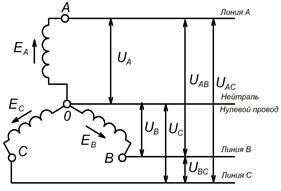 Напряжение между началом и концом одной фазы или линейным и нулевым проводом называется фазным напряжением (UA, UB, UC).