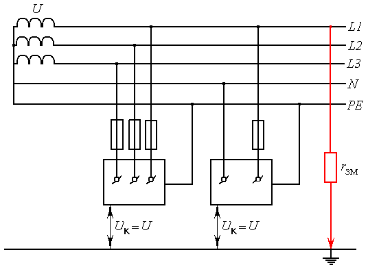 Как правило, сопротивление растеканию тока в месте замыкания на землю r зм, которое оказывает грунт току при случайном замыкании фазы на землю, во много раз больше сопротивления специально выполненного заземления нейтрали r зм. Поэтому U к оказывается незначительным.