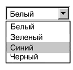 Choice color = new Choice();color.add("Белый");color.add("Зеленый");color.add("Синий");color.add("Черный");add(color);В обычном состоянии компонент отображает только выбранный вариант. В процессе выбора отображается весь набор вариантов. На рисунке представлен выпадающий список в обоих состояниях:
