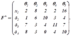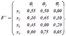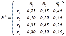 Приклад. Припустимо, що при переході на випуск нових видів продукції можливі чотири рішення Х= (x1, х2, x3, х4). Кожному із них відповідає випуск певного виду продукції чи комбінація видів. Результати вибору залежать від невизначеного економічного середовища, наприклад, від забезпеченості виробництва матеріальними ресурсами, яке, наприклад, може бути трьох видів: Θ = {01, 02, 03}. Відома також матриця функціоналу оцінювання F = F+ (наприклад, це прибуток, що виражається в умовних одиницях):