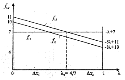 Таким чином, за критерієм Гурвіца оптимальними можуть бути рішення х3 та х2, але ні за яких "λ" рішення х1 не є оптимальним. Множина значень [0,1] параметра "λ" поділилась на дві підмножини: