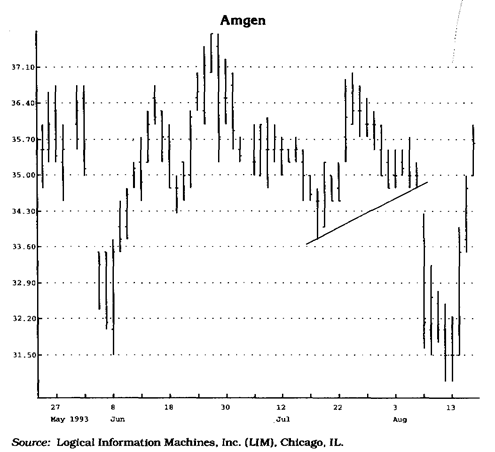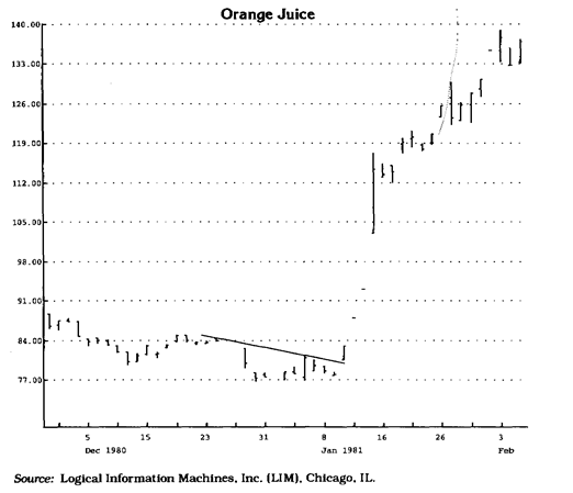 Вскоре мне стало ясно, что многие преимущества данного метода являются результатом правильного определения и применения TD-точек и TD-линий. Необъяснимые ценовые разрывы, возникавшие ранее как гром среди ясного неба, приобрели особое значение и важность. В частности, стали более понятны такие явления, как резкий "рывок" цен вьпие TD-линий предложения (см. рис. 1.11),