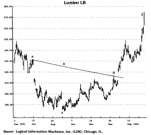 Рис. 1.13 После того, как произошел ценовой прорыв вверх TD-линии предложения А-В, движение цен повторилось в зеркальном отражении. Ценовой ориентир Z рассчитывается следующим образом: разность между минимальной ценой ниже TD-линии (Y) и ценой на TD-линии в тот же день (X) прибавляется к цене прорыва.