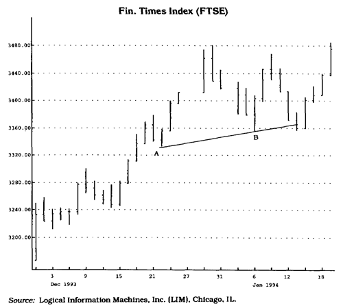 Рис. 1.31 Хотя цены поднялись выше ТО-линяи предложения А-В, на следующий день цена в момент открытия была ниже цены закрытия в день прорыва и затем продолжала падать, опустившись ниже нисходящей линии А-В. Такая динамика цен делает прорыв недействительным.