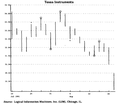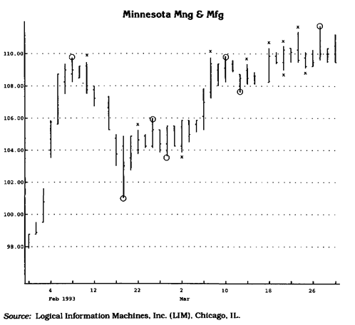Рис. 1.33 TD-точки с протяженностью третьего уровня обозначены на графике кружками (вокруг максимумов и минимумов). По определению, они одновременно являются TD-точкми с протяженностью первого уровня. Максимумы и минимумы, помеченные буквой "X", — точки первого уровня, они не являются точками третьего уровня, поскольку не все максимумы (минимумы) за три дня, непосредственно предшествующие и непосредственно следующие за ними, являются менее высокими максимумами (менее низкими минимумами).