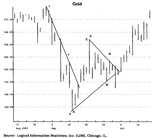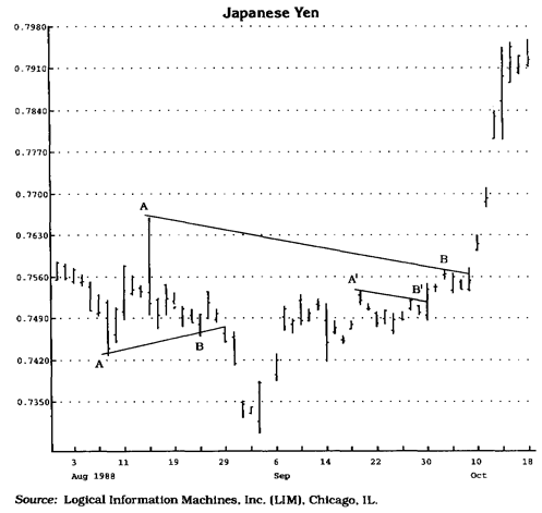 Рис. 1.35 Ожидая формирования TD-точки более высокого уровня, аналитик опрометчиво отказался от TD-линий низшего уровня, которые оказались истинными. На графике показаны два истинных прорыва, которые можно было выявить, если бы аналитик пользовался точками первого и второго уровней, но не точками третьего уровня (линия А-В). Другой пример показывает, что успешный прогноз был возможен, если бы были выбраны точки первого, а не второго уровня (А’-B’)