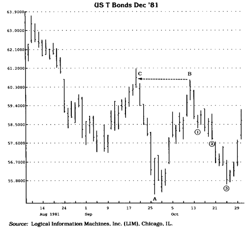 Я представил эти данные своим слушателям, указав, что цены в результате коррекции опустятся до этой отметки. Кроме того, на основании прорыва TD-линии я рассчитал ценовой ориентир, который оказался равен 1650 (см. главу I, посвященную линиям тренда). Просто удивительно, как оба результата подкрепляли друг друга, придавая достоверность моему прогнозу, хотя оба были получены с помощью чисто механических, вполне объективных процедур.