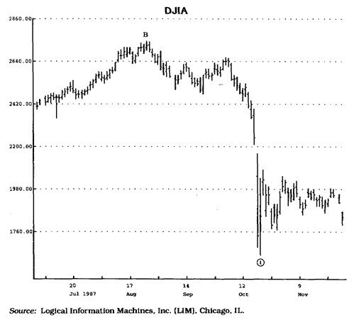 Следует отметить, что существуют и исключения из описанных выше правил определения величины коррекции. Опыт подсказывает, что приведенные примеры характерны для ситуаций, когда цены колеблются в определенном торговом коридоре (trading range). Если цены поднимаются до рекордных значений, выбор критической точки (ценового минимума) становится невозможным, поскольку слева на графике нет ни одного ценового пика. В таких случаях я обычно умножаю максимальную цену на коэффициенты 0,618 и 0,382. В этой связи мне вспоминаются два случая. Первый — это когда я предсказал обвал на фондовом рынке в 1987 году, выступая перед группой биржевиков в Нью-Йорке. В то время августовский ценовой максимум промышленного индекса Доу-Джонса составлял примерно 2747, что являлось рекордным показателем. Умножив это значение на коэффициент 0,618, я смог рассчитать уровень поддержки (коррекции), который составил примерно 1697 (см. рис. 2.6а).
