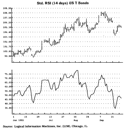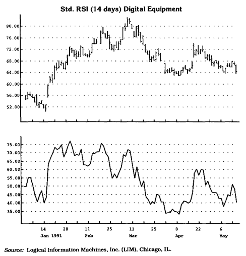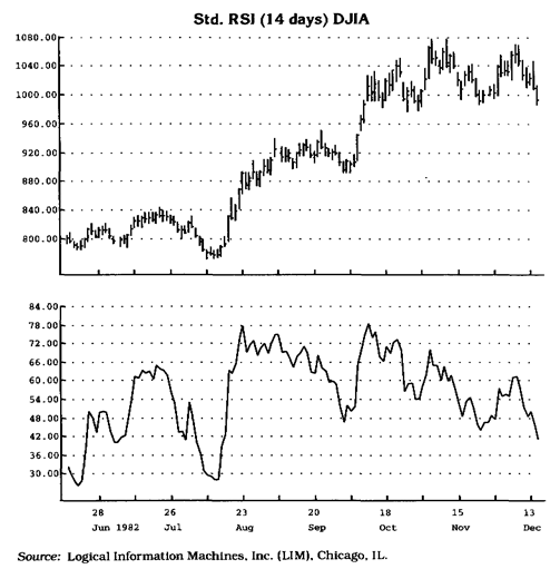 Рис. 3.1 14-дневный индикатор RSI оставался в области перекупленности (выше отметки 65) в течение длительного периода времени в августе, а также в октябре. Однако подобные затяжные состояния перекупленности рынка отнюдь не свидетельствуют о целесообразности продаж. Наоборот, в эти периоды следует либо оставаться в стороне, либо покупать, поскольку спрос настолько высок, что ему потребуется некоторое время, чтобы уравновеситься. О возможности перелома тенденции можно говорить только тогда, когда кривая индикатора вновь войдет в область перекупленности и зафиксирует умеренное, но не экстремальное, значение.