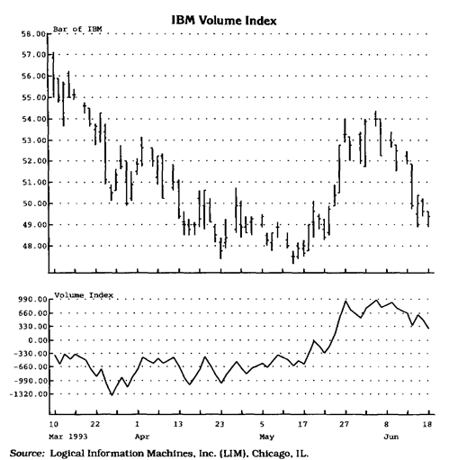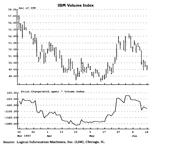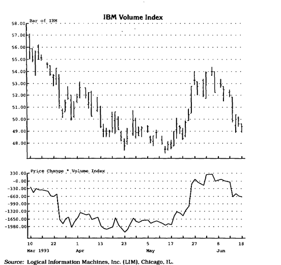 Еще один, более сложный метод заключается в том, чтобы анализировать каждую сделку (тик) и постоянно пересчитывать индекс, умножая величину изменения цены на количество акций (контрактов). Некоторые аналитики предпочитают анализировать только крупные сделки (более 10 000 акций), полагая, что они совершаются хорошо информированными, опытными инвесторами, чья агрессивность определяется ценовыми уступками, на которые они готовы пойти. Еще одна группа аналитиков также учитывает изменение цены и объем, но рассчитывает индекс по итогам всего торгового дня. В этом случае изменение цены за день умножается на объем торговли данного дня (см. рис. 5.2).