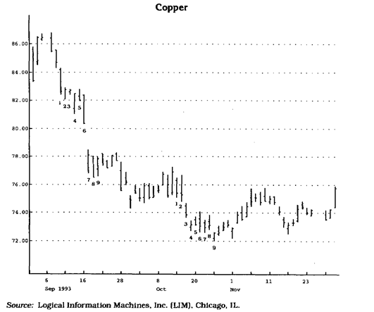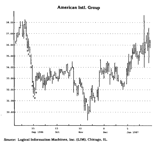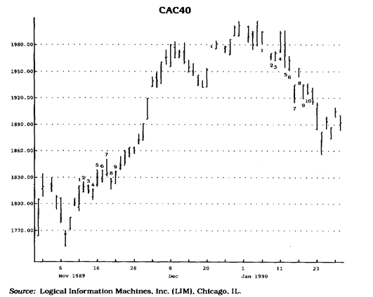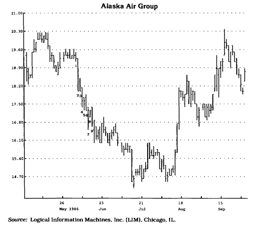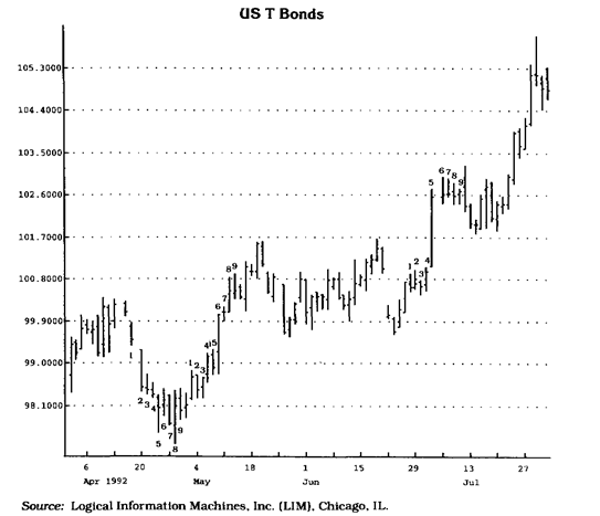 Рис. 7.11 Как и на рис. 7.10, на этом графике видно несколько установочных наборов. В обоих случаях обратите внимание на обычно появляющийся после девятидневного установочного набора краткосрочный пик (или впадину) — ценовой "кашель" или, если хотите, "заикание".